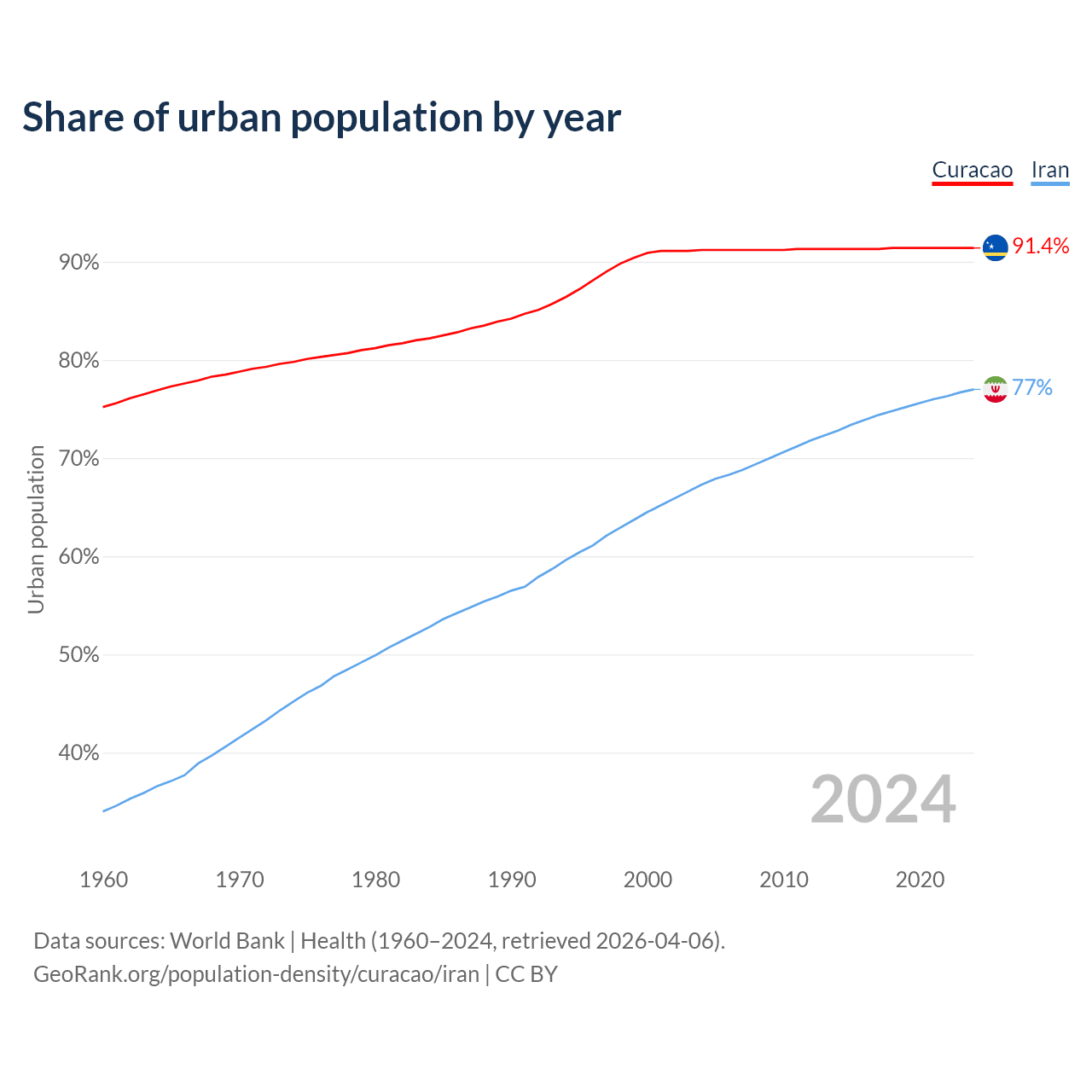 From 2004 to 2024, the share of urban population changed from 91.2% to 91.4% in Curacao and from 67.3% to 77% in Iran.