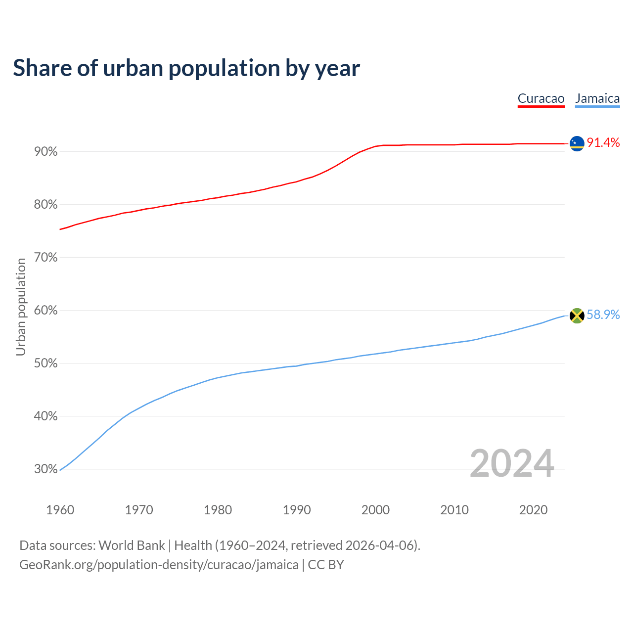 From 2004 to 2024, the share of urban population changed from 91.2% to 91.4% in Curacao and from 52.6% to 58.9% in Jamaica.