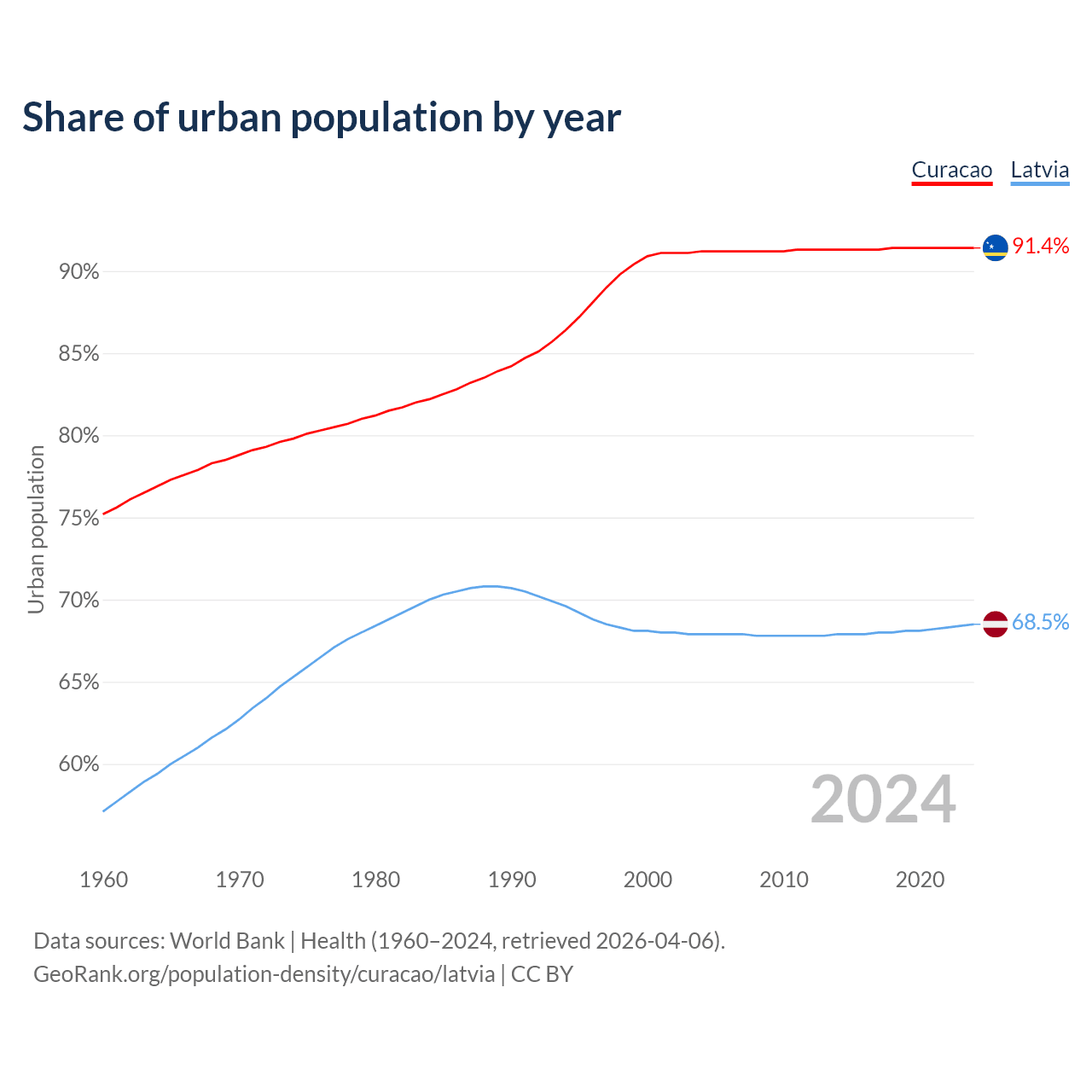From 2004 to 2024, the share of urban population changed from 91.2% to 91.4% in Curacao and from 67.9% to 68.5% in Latvia.