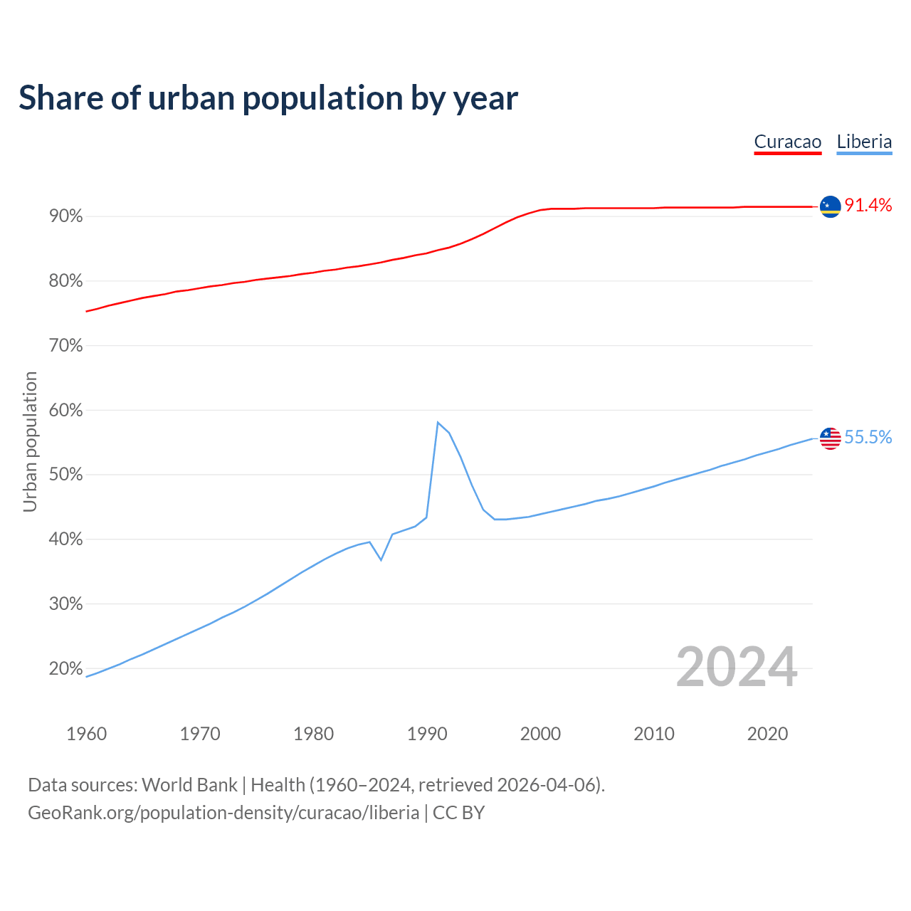 From 2004 to 2024, the share of urban population changed from 91.2% to 91.4% in Curacao and from 45.4% to 55.5% in Liberia.
