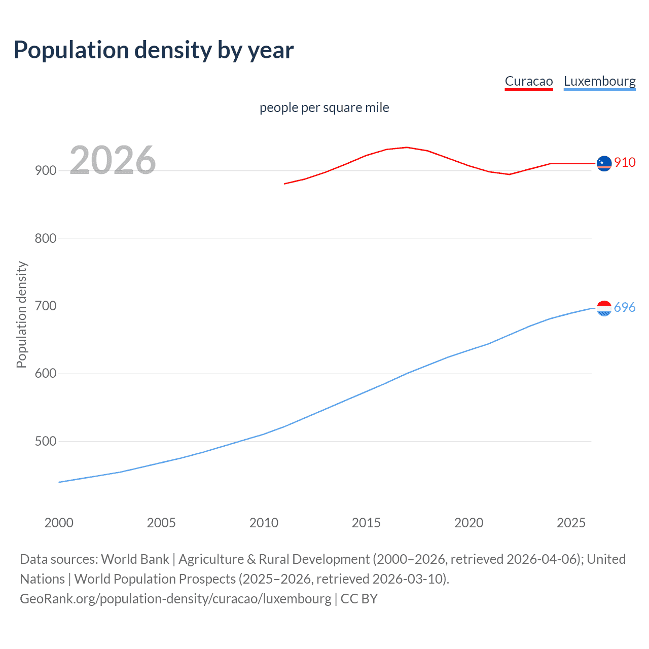 From 2011 to 2026, population density in Curacao increased by 3.41%, compared to a 33.5% growth in Luxembourg.