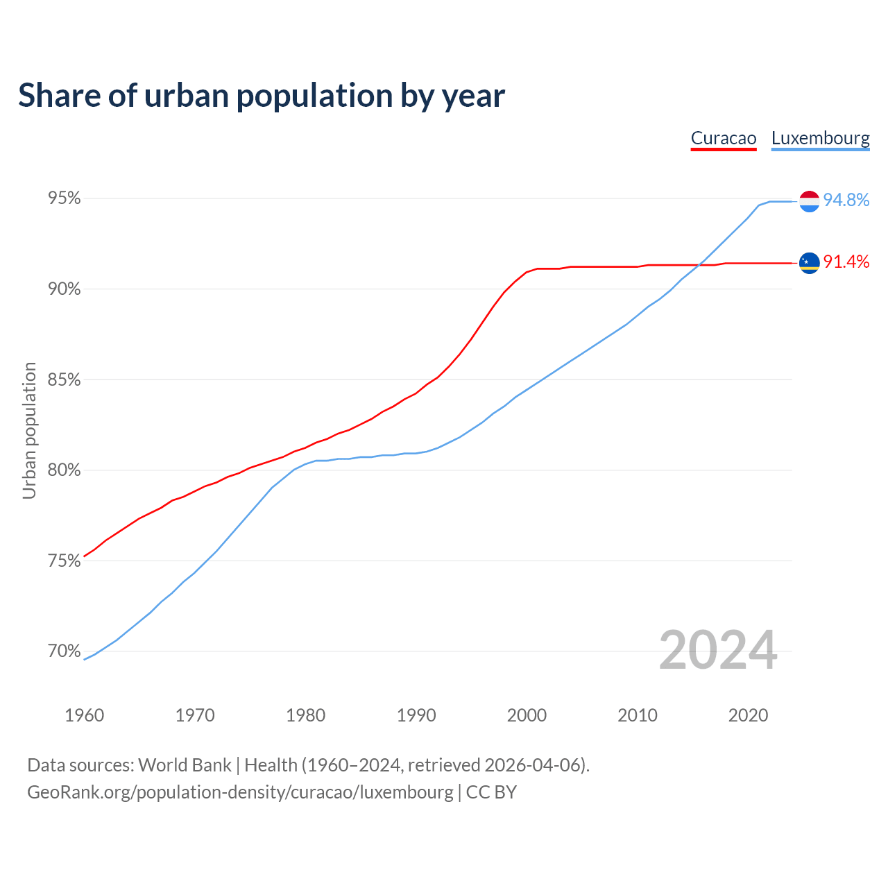 From 2004 to 2024, the share of urban population changed from 91.2% to 91.4% in Curacao and from 86% to 94.8% in Luxembourg.