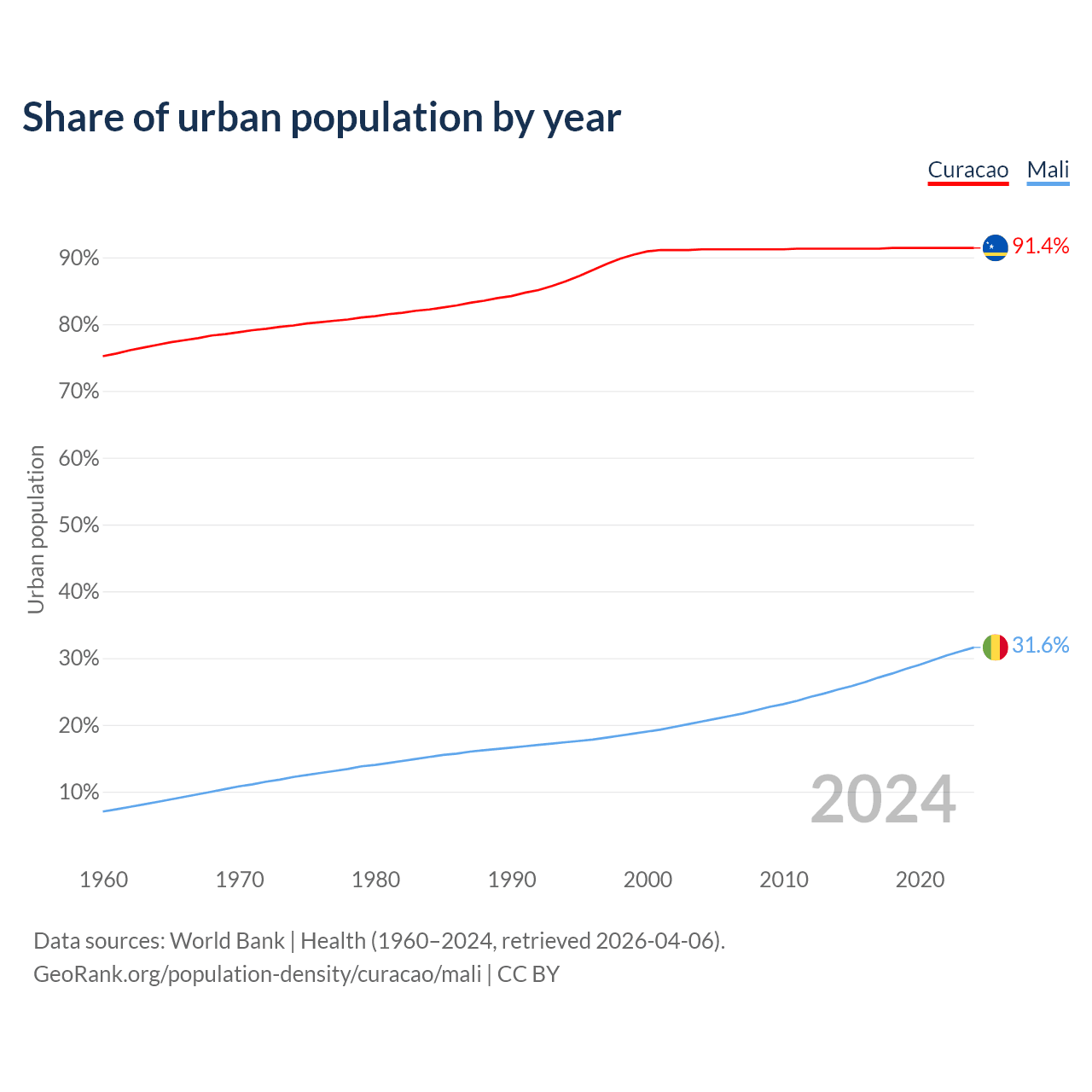 From 2004 to 2024, the share of urban population changed from 91.2% to 91.4% in Curacao and from 20.5% to 31.6% in Mali.