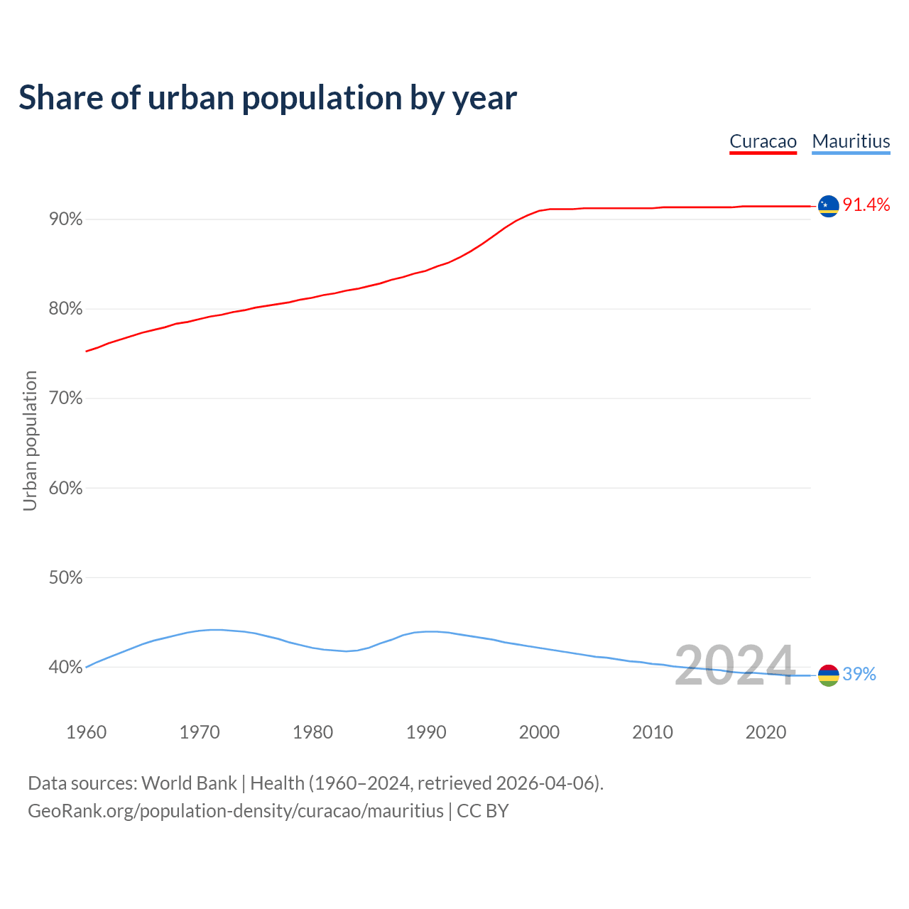 From 2004 to 2024, the share of urban population changed from 91.2% to 91.4% in Curacao and from 41.3% to 39% in Mauritius.