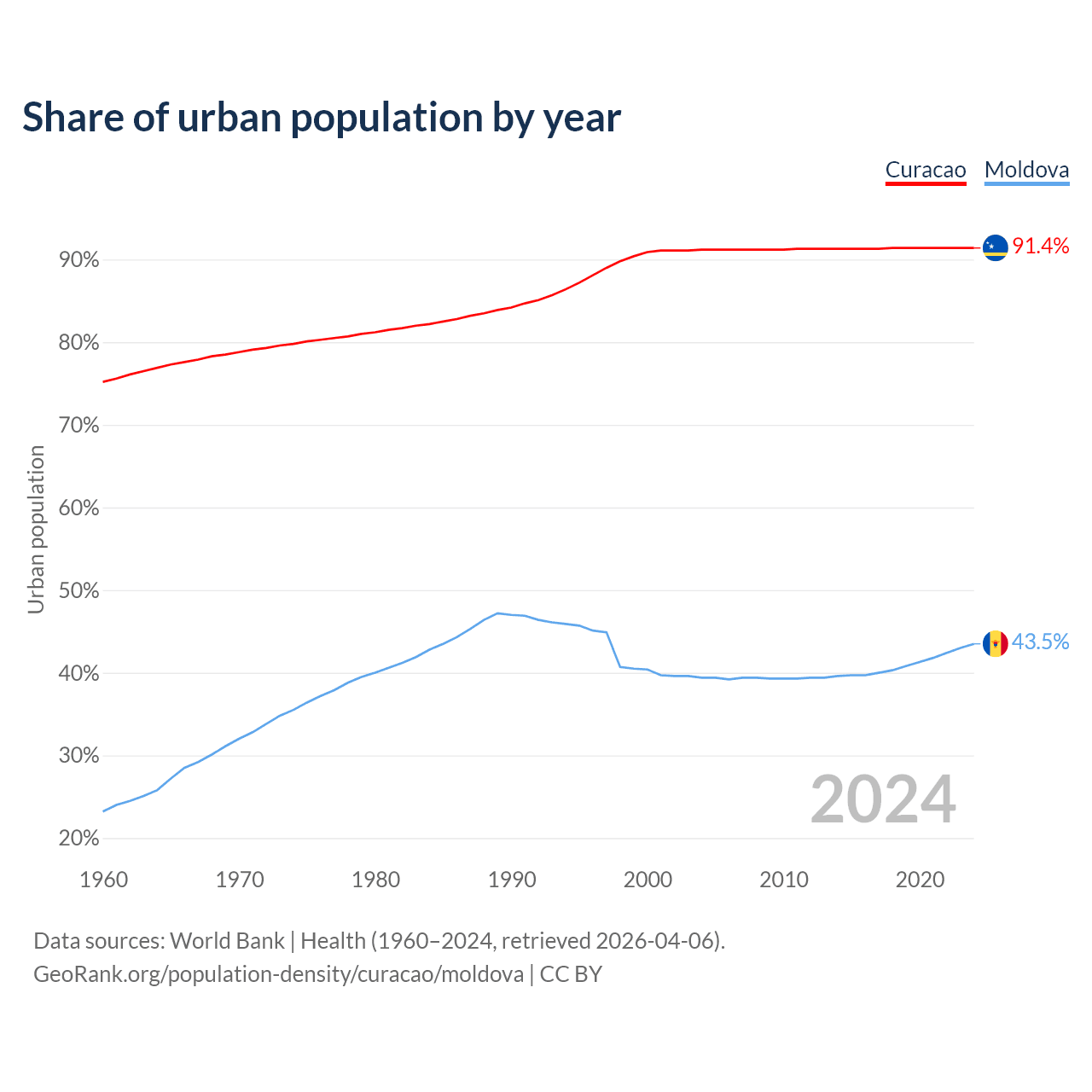 From 2004 to 2024, the share of urban population changed from 91.2% to 91.4% in Curacao and from 39.4% to 43.5% in Moldova.