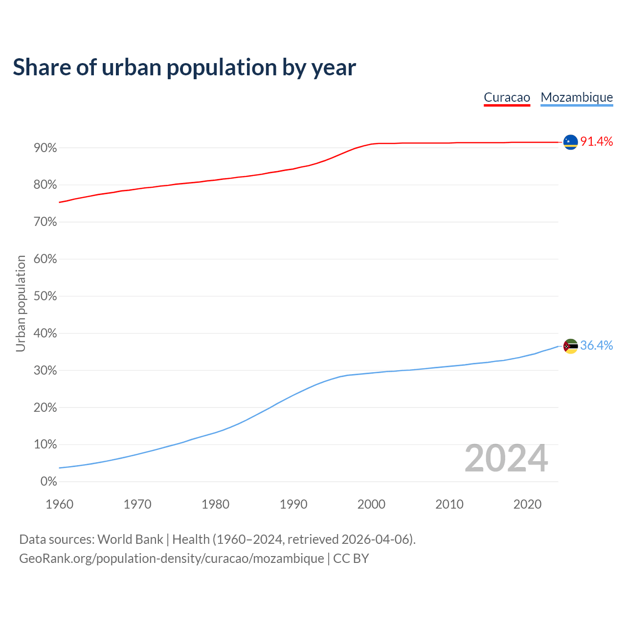 From 2004 to 2024, the share of urban population changed from 91.2% to 91.4% in Curacao and from 29.9% to 36.4% in Mozambique.