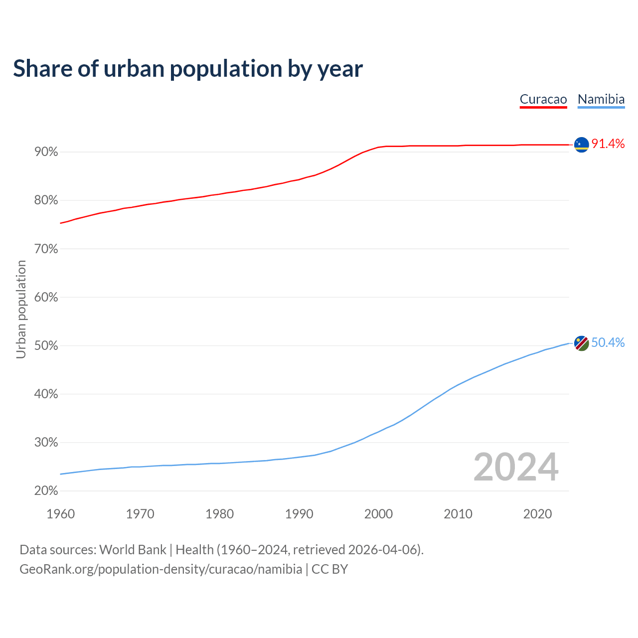 From 2004 to 2024, the share of urban population changed from 91.2% to 91.4% in Curacao and from 35.5% to 50.4% in Namibia.