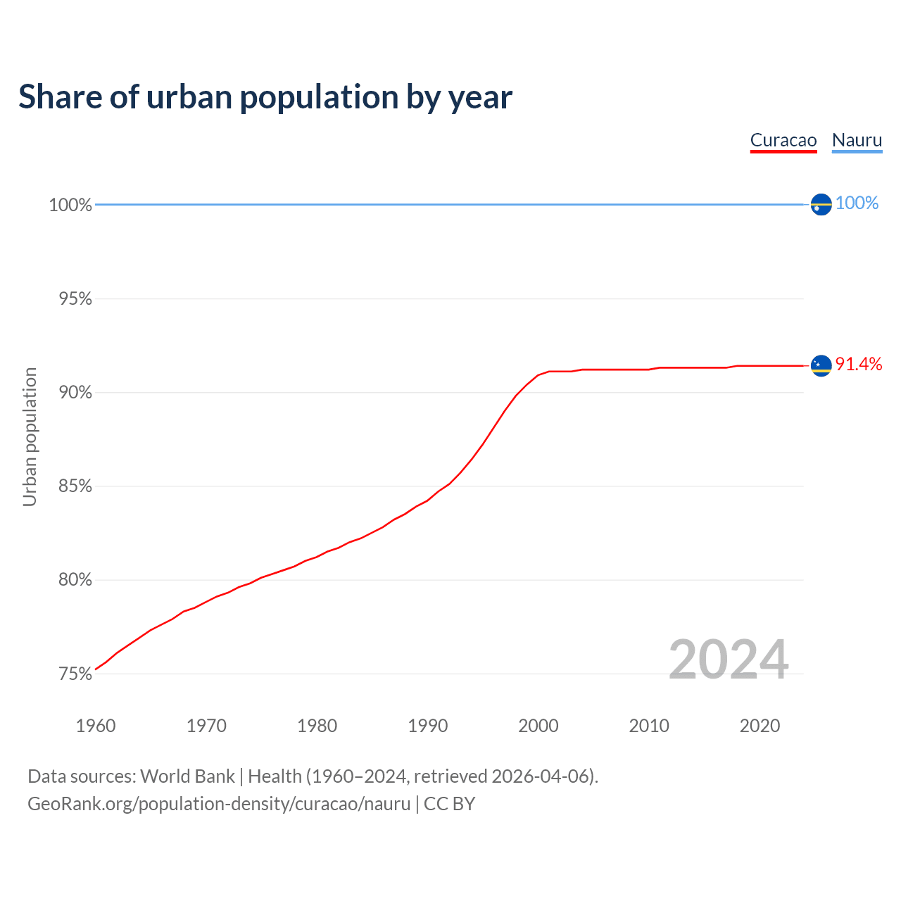 From 2004 to 2024, the share of urban population changed from 91.2% to 91.4% in Curacao and from 100% to 100% in Nauru.