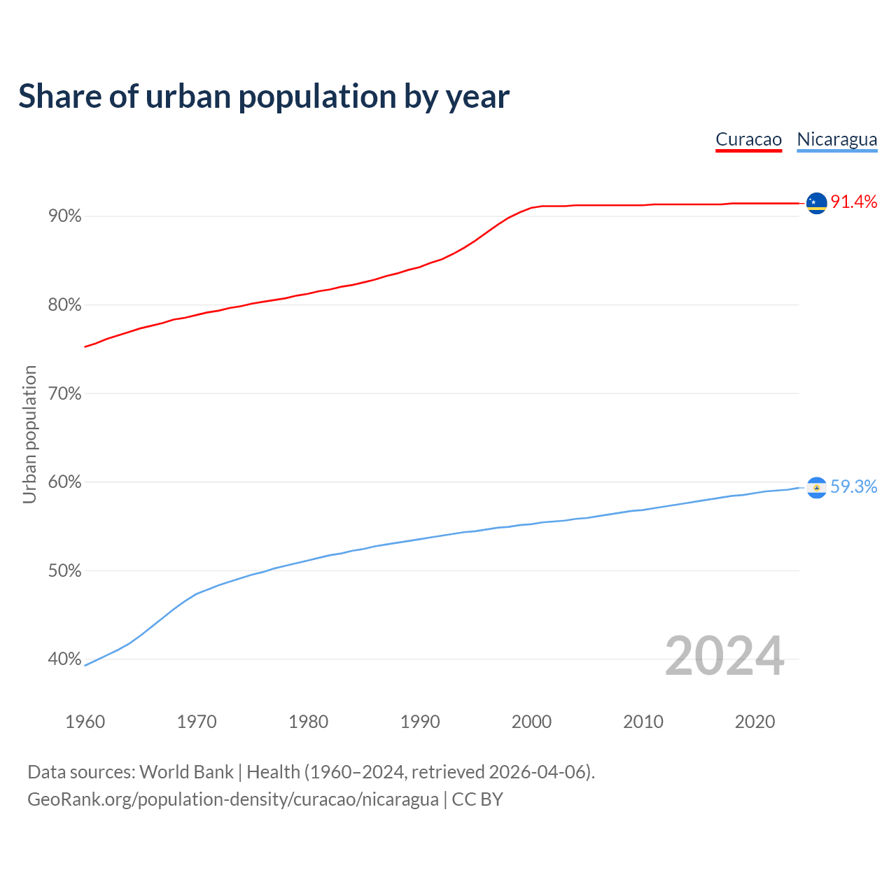 From 2004 to 2024, the share of urban population changed from 91.2% to 91.4% in Curacao and from 55.8% to 59.3% in Nicaragua.