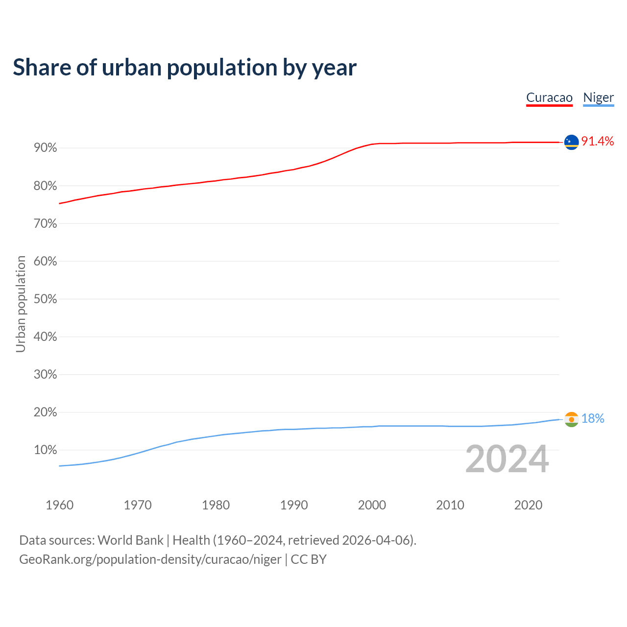 From 2004 to 2024, the share of urban population changed from 91.2% to 91.4% in Curacao and from 16.3% to 18% in Niger.