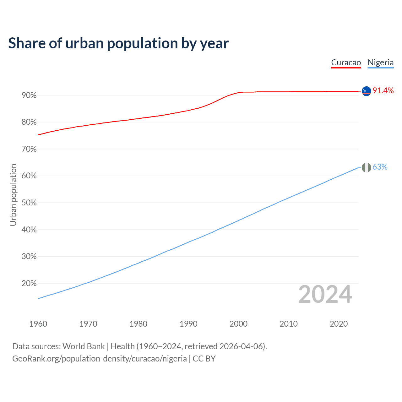 From 2004 to 2024, the share of urban population changed from 91.2% to 91.4% in Curacao and from 46.7% to 63% in Nigeria.