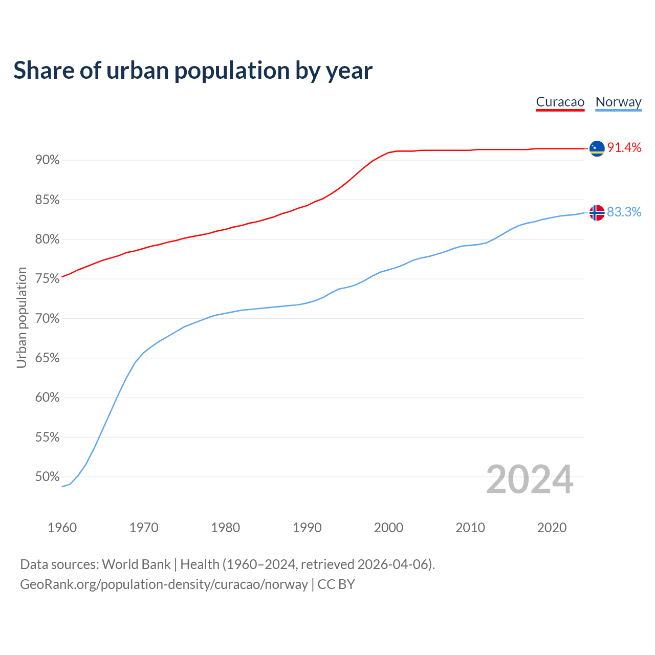 From 2004 to 2024, the share of urban population changed from 91.2% to 91.4% in Curacao and from 77.6% to 83.3% in Norway.