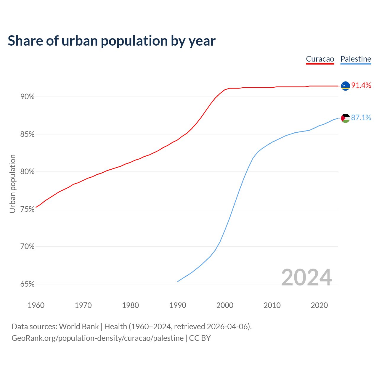 From 2004 to 2024, the share of urban population changed from 91.2% to 91.4% in Curacao and from 79% to 87.1% in Palestine.