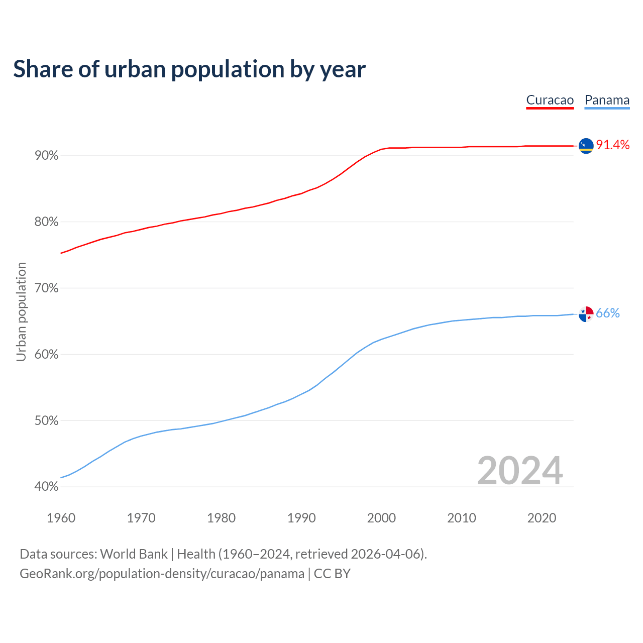 From 2004 to 2024, the share of urban population changed from 91.2% to 91.4% in Curacao and from 63.8% to 66% in Panama.