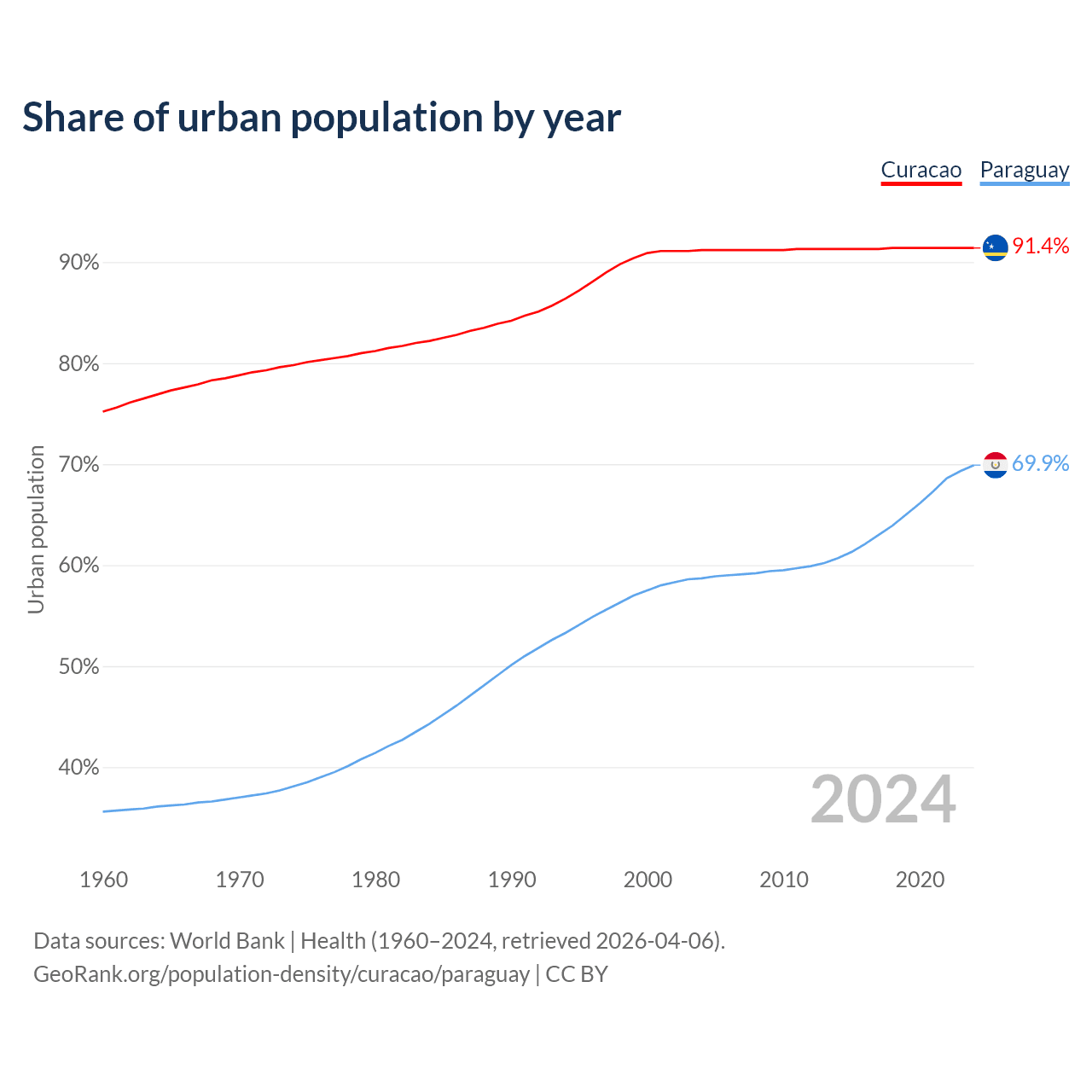 From 2004 to 2024, the share of urban population changed from 91.2% to 91.4% in Curacao and from 58.7% to 69.9% in Paraguay.