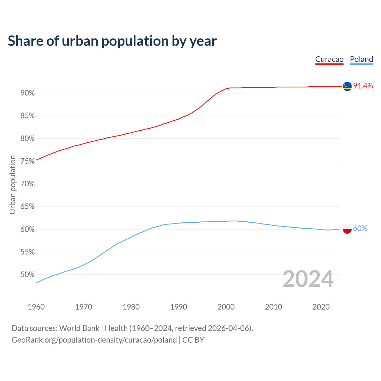 From 2004 to 2024, the share of urban population changed from 91.2% to 91.4% in Curacao and from 61.7% to 60% in Poland.