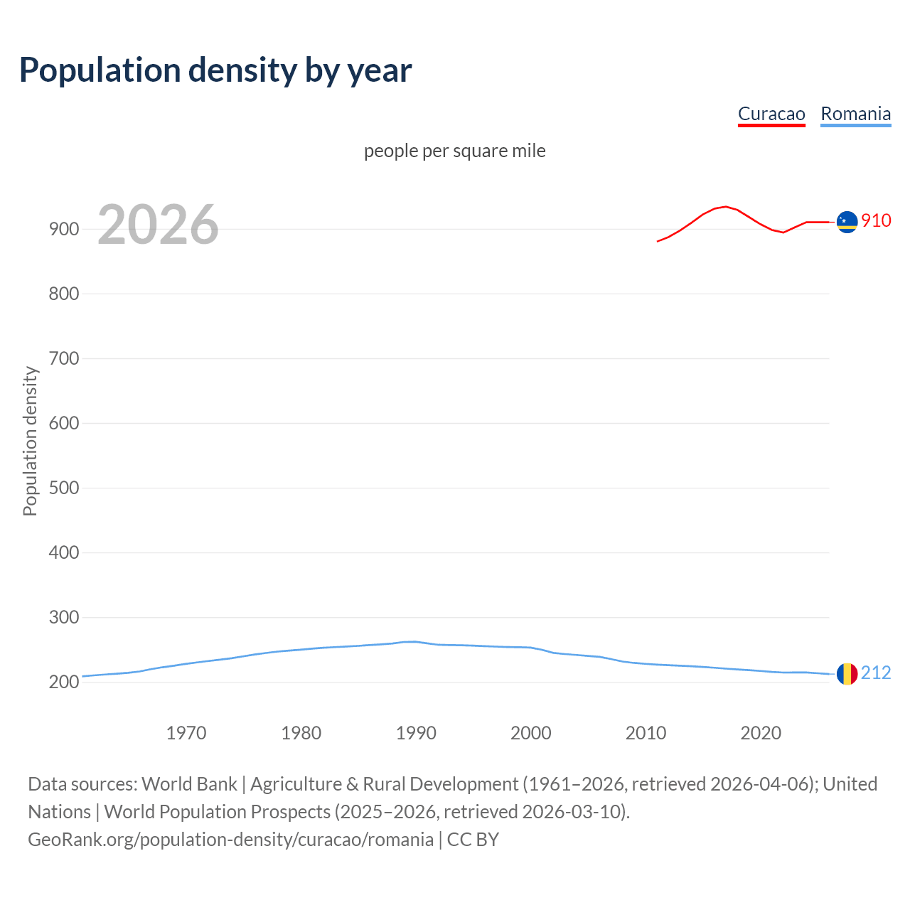 From 2011 to 2026, population density in Curacao increased by 3.41%, compared to a 6.46% decline in Romania.