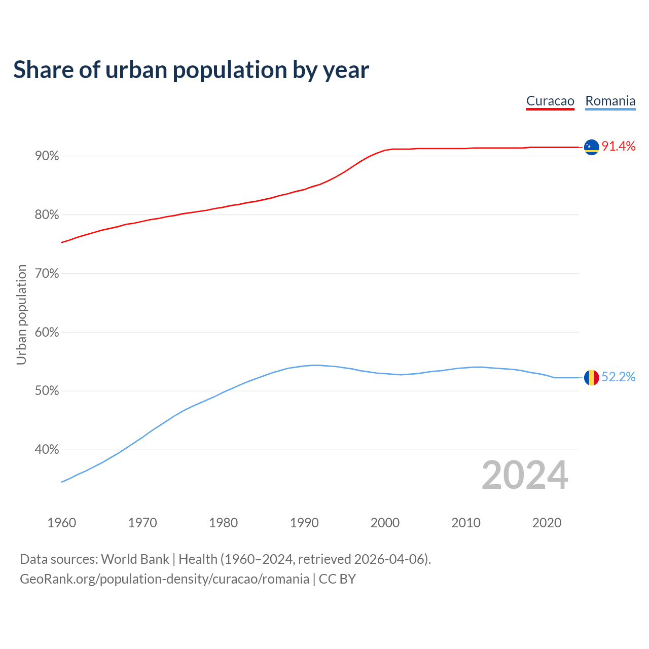 From 2004 to 2024, the share of urban population changed from 91.2% to 91.4% in Curacao and from 52.9% to 52.2% in Romania.