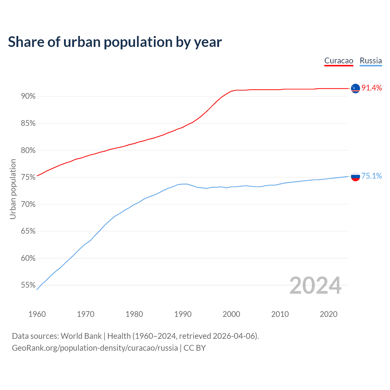 From 2004 to 2024, the share of urban population changed from 91.2% to 91.4% in Curacao and from 73.3% to 75.1% in Russia.