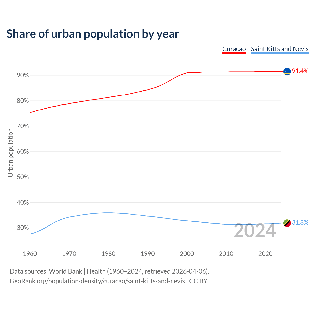 From 2004 to 2024, the share of urban population changed from 91.2% to 91.4% in Curacao and from 32.1% to 31.8% in Saint Kitts and Nevis.