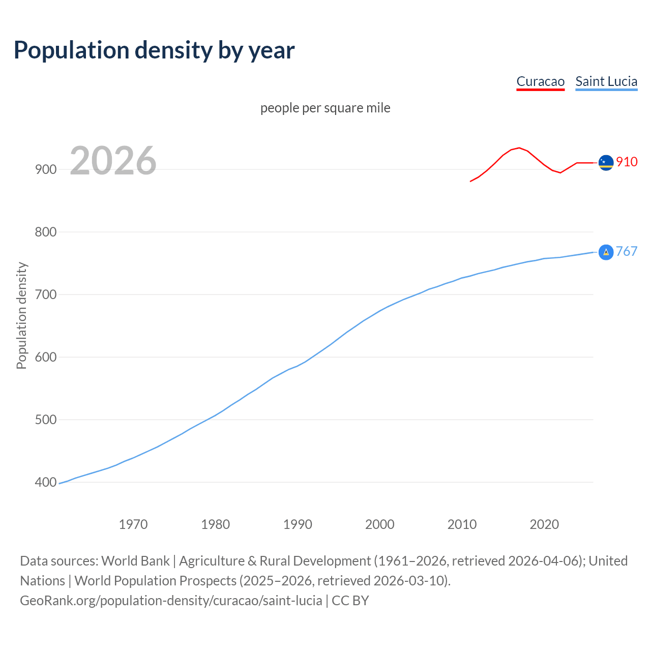 From 2011 to 2026, population density in Curacao increased by 3.41%, compared to a 5.1% growth in Saint Lucia.