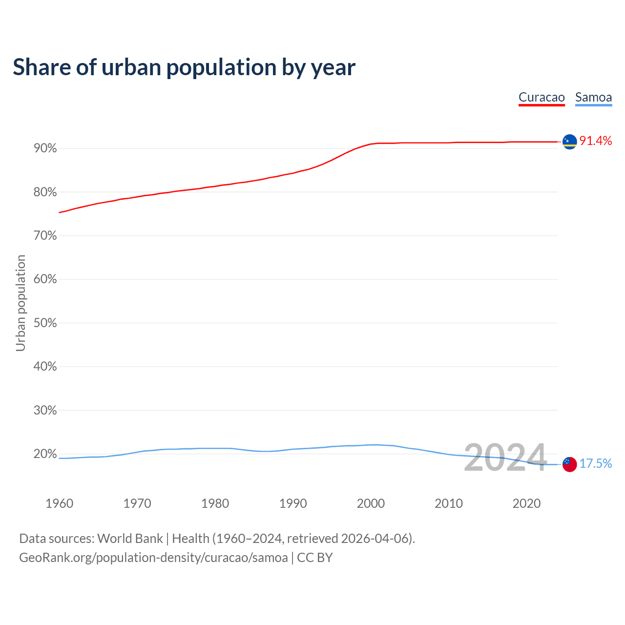 From 2004 to 2024, the share of urban population changed from 91.2% to 91.4% in Curacao and from 21.5% to 17.5% in Samoa.