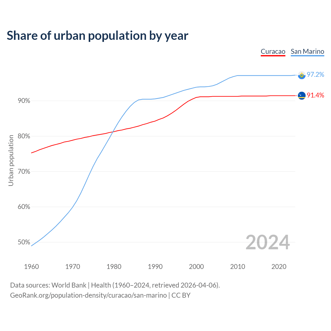 From 2004 to 2024, the share of urban population changed from 91.2% to 91.4% in Curacao and from 94.2% to 97.2% in San Marino.