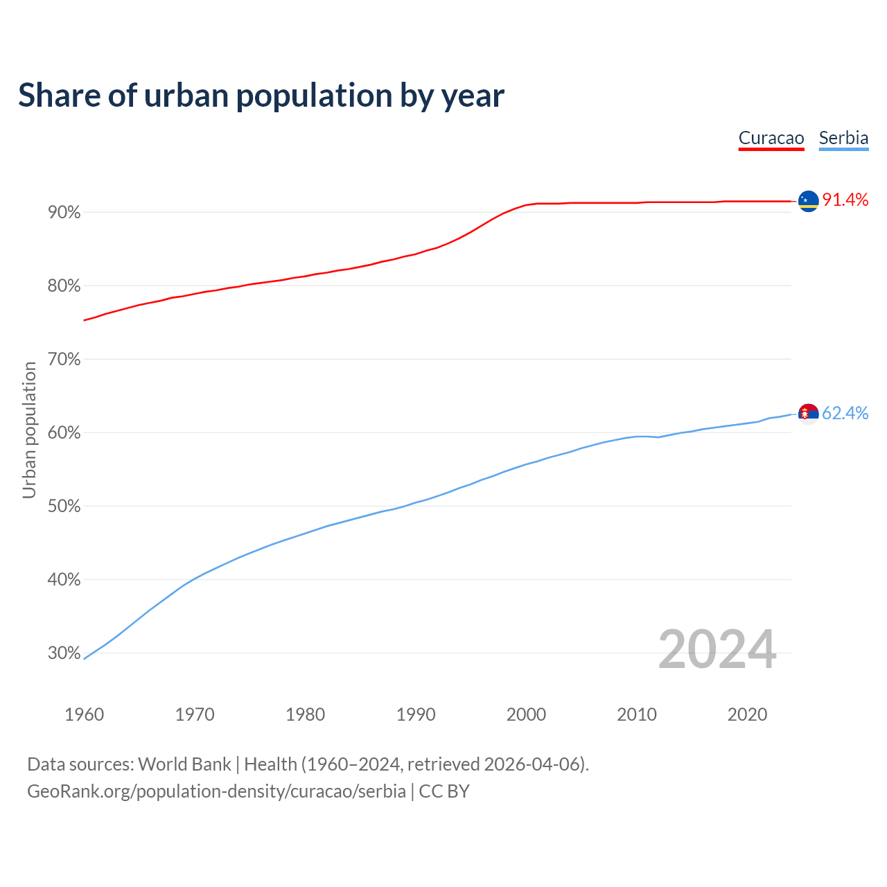 From 2004 to 2024, the share of urban population changed from 91.2% to 91.4% in Curacao and from 57.3% to 62.4% in Serbia.