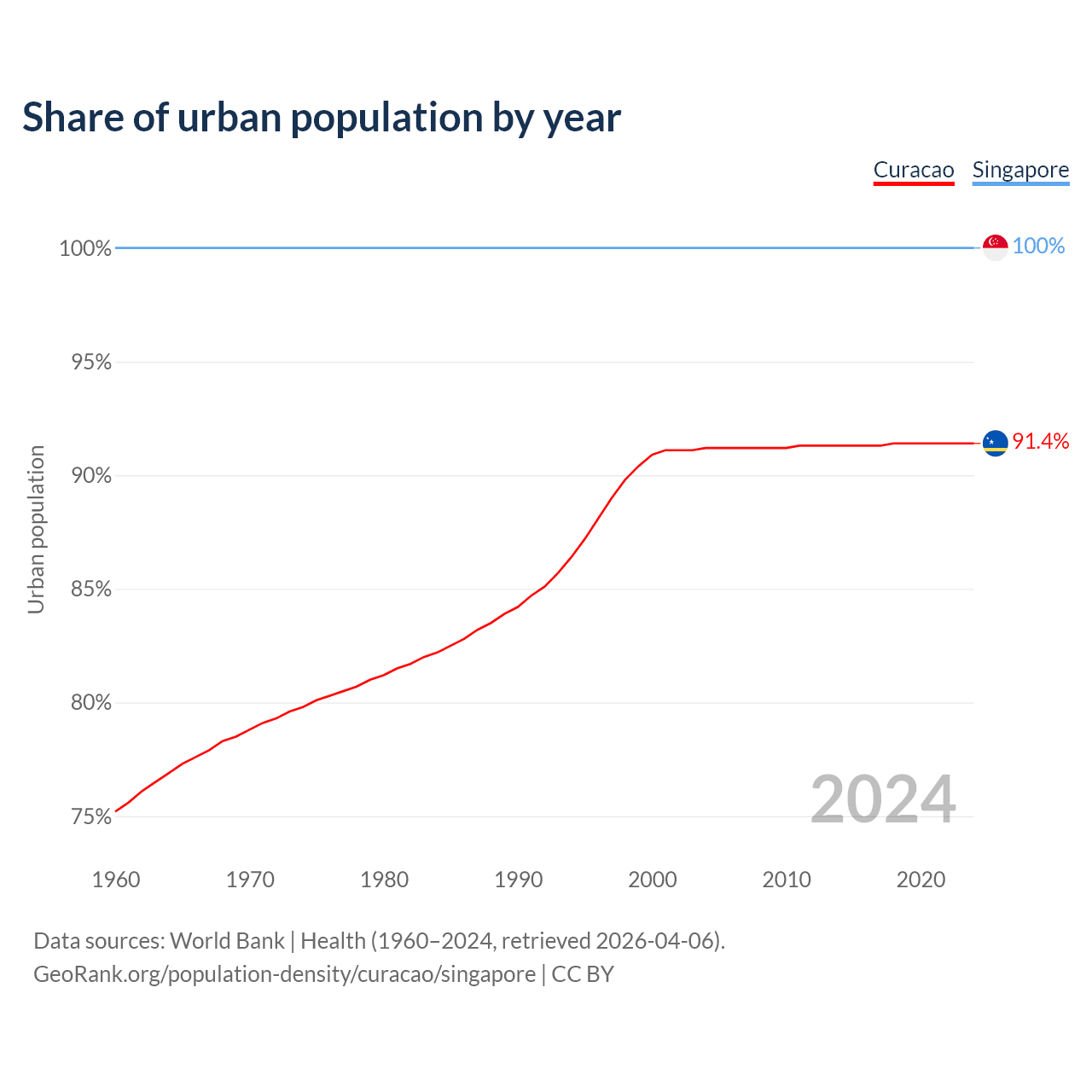 From 2004 to 2024, the share of urban population changed from 91.2% to 91.4% in Curacao and from 100% to 100% in Singapore.