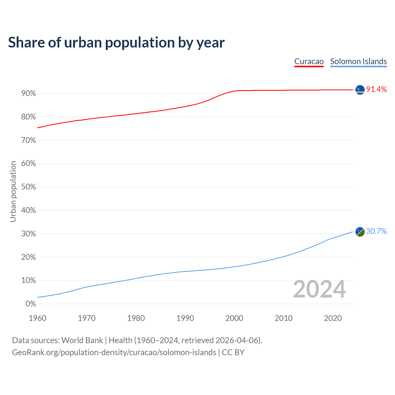 From 2004 to 2024, the share of urban population changed from 91.2% to 91.4% in Curacao and from 17.2% to 30.7% in the Solomon Islands.