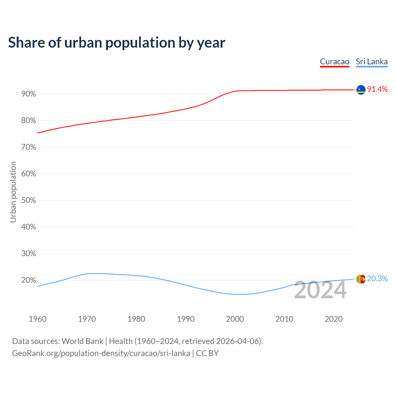 From 2004 to 2024, the share of urban population changed from 91.2% to 91.4% in Curacao and from 14.9% to 20.3% in Sri Lanka.