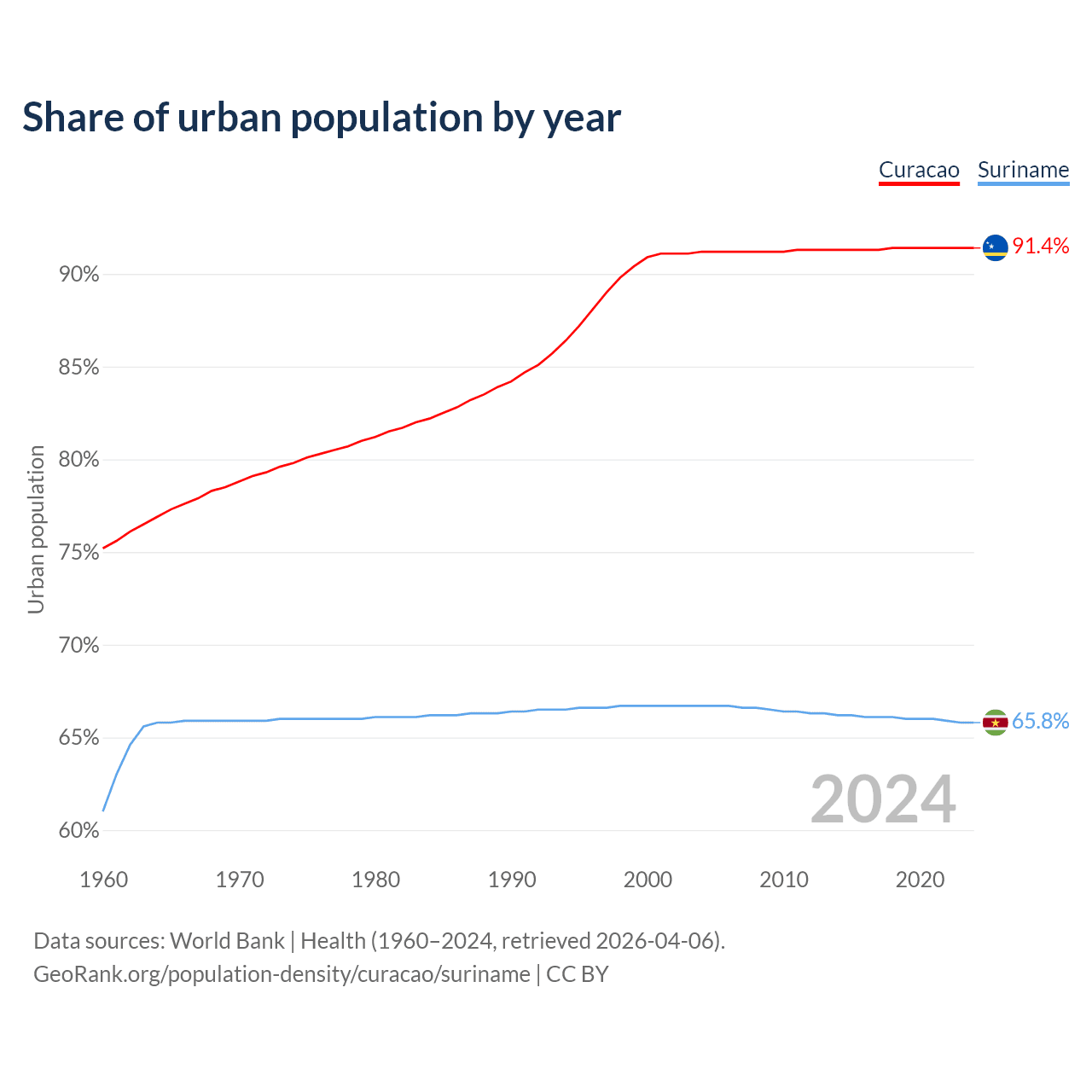 From 2004 to 2024, the share of urban population changed from 91.2% to 91.4% in Curacao and from 66.7% to 65.8% in Suriname.