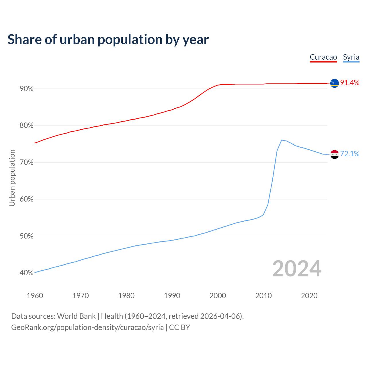 From 2004 to 2024, the share of urban population changed from 91.2% to 91.4% in Curacao and from 53.5% to 72.1% in Syria.