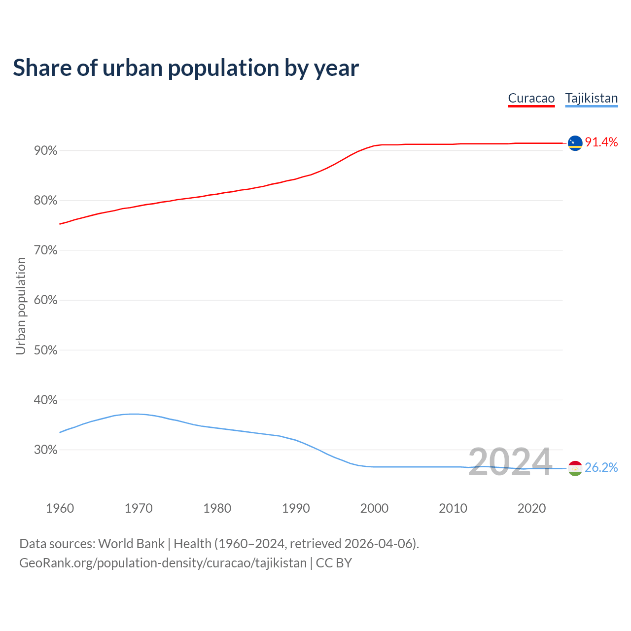 From 2004 to 2024, the share of urban population changed from 91.2% to 91.4% in Curacao and from 26.5% to 26.2% in Tajikistan.