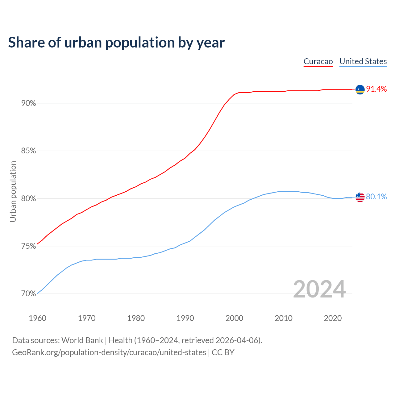 From 2004 to 2024, the share of urban population changed from 91.2% to 91.4% in Curacao and from 80% to 80.1% in the United States.