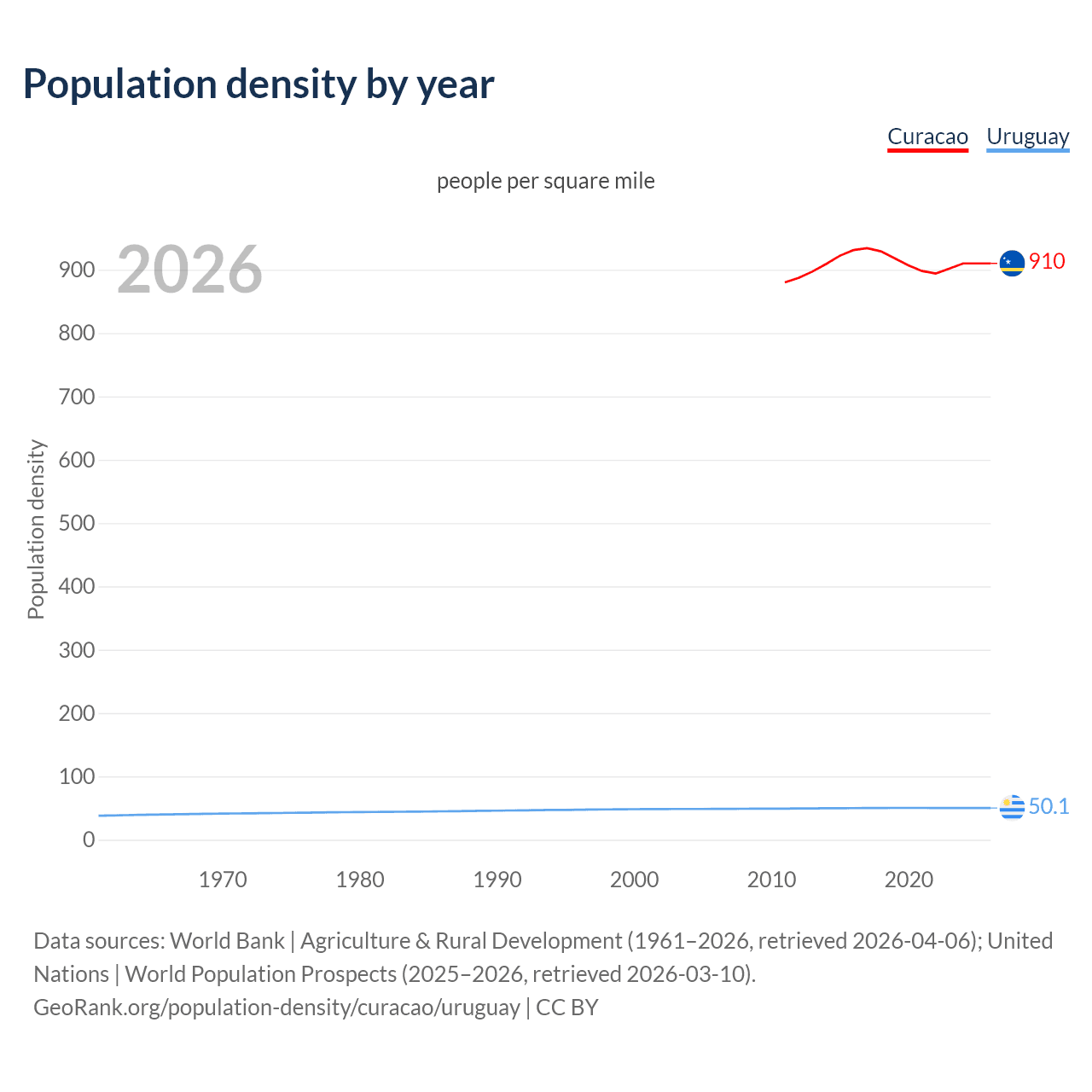From 2011 to 2026, population density in Curacao increased by 3.41%, compared to a 1.68% growth in Uruguay.