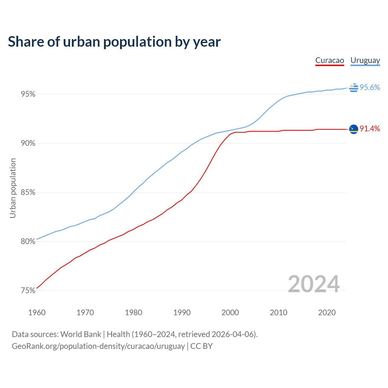 From 2004 to 2024, the share of urban population changed from 91.2% to 91.4% in Curacao and from 91.8% to 95.6% in Uruguay.
