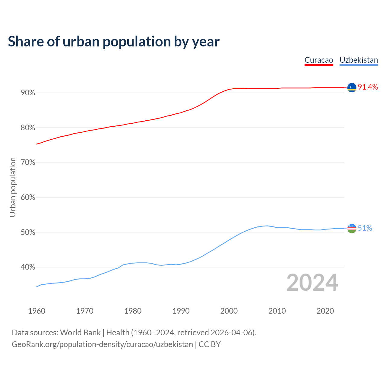 From 2004 to 2024, the share of urban population changed from 91.2% to 91.4% in Curacao and from 50.6% to 51% in Uzbekistan.