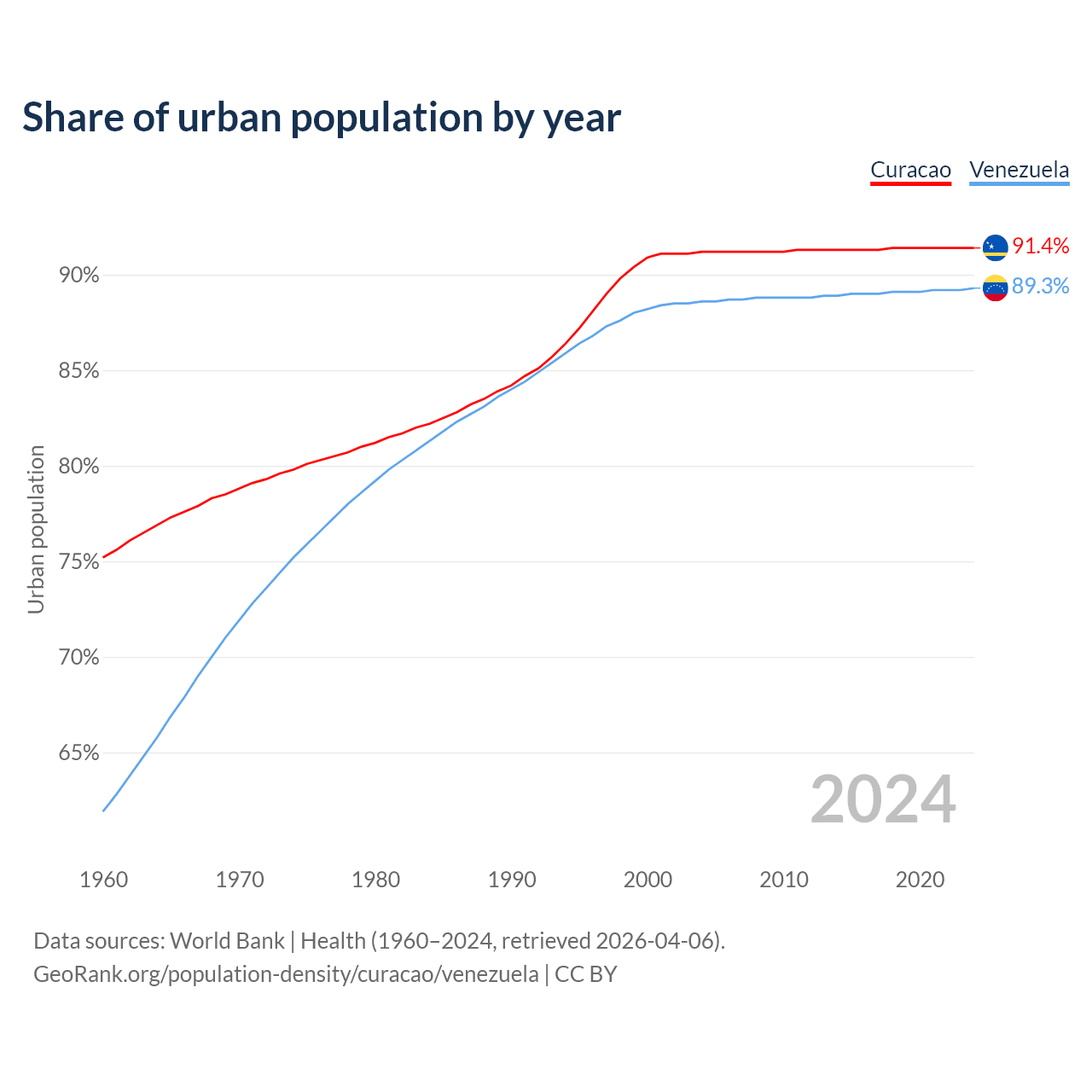 From 2004 to 2024, the share of urban population changed from 91.2% to 91.4% in Curacao and from 88.6% to 89.3% in Venezuela.