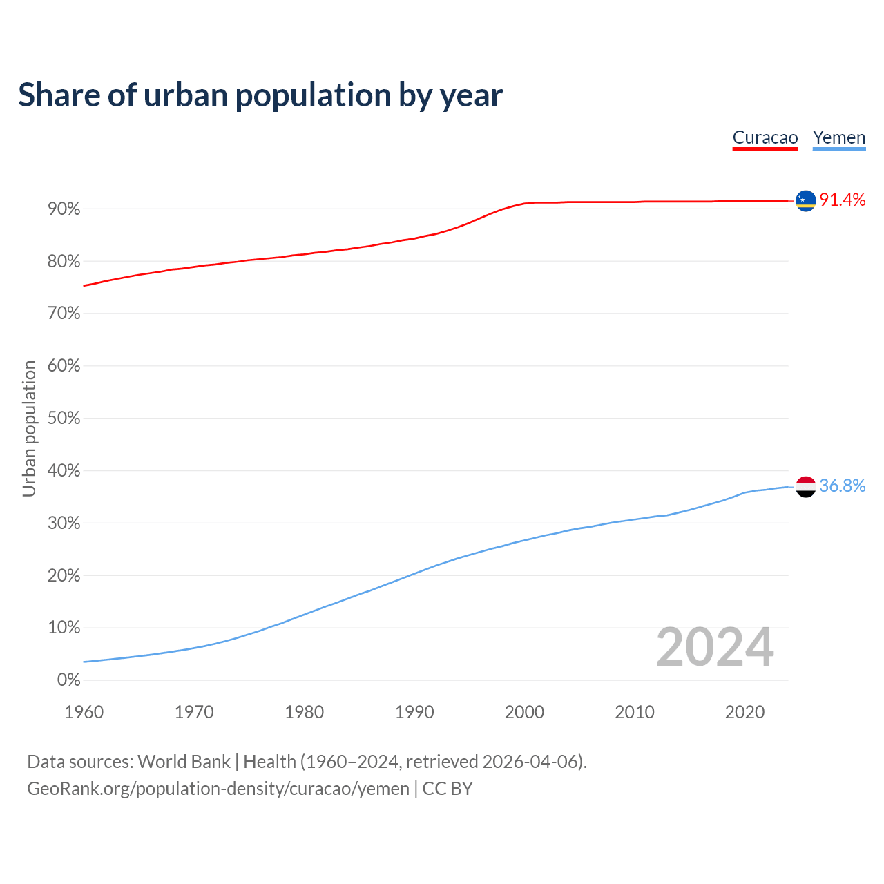 From 2004 to 2024, the share of urban population changed from 91.2% to 91.4% in Curacao and from 28.5% to 36.8% in Yemen.