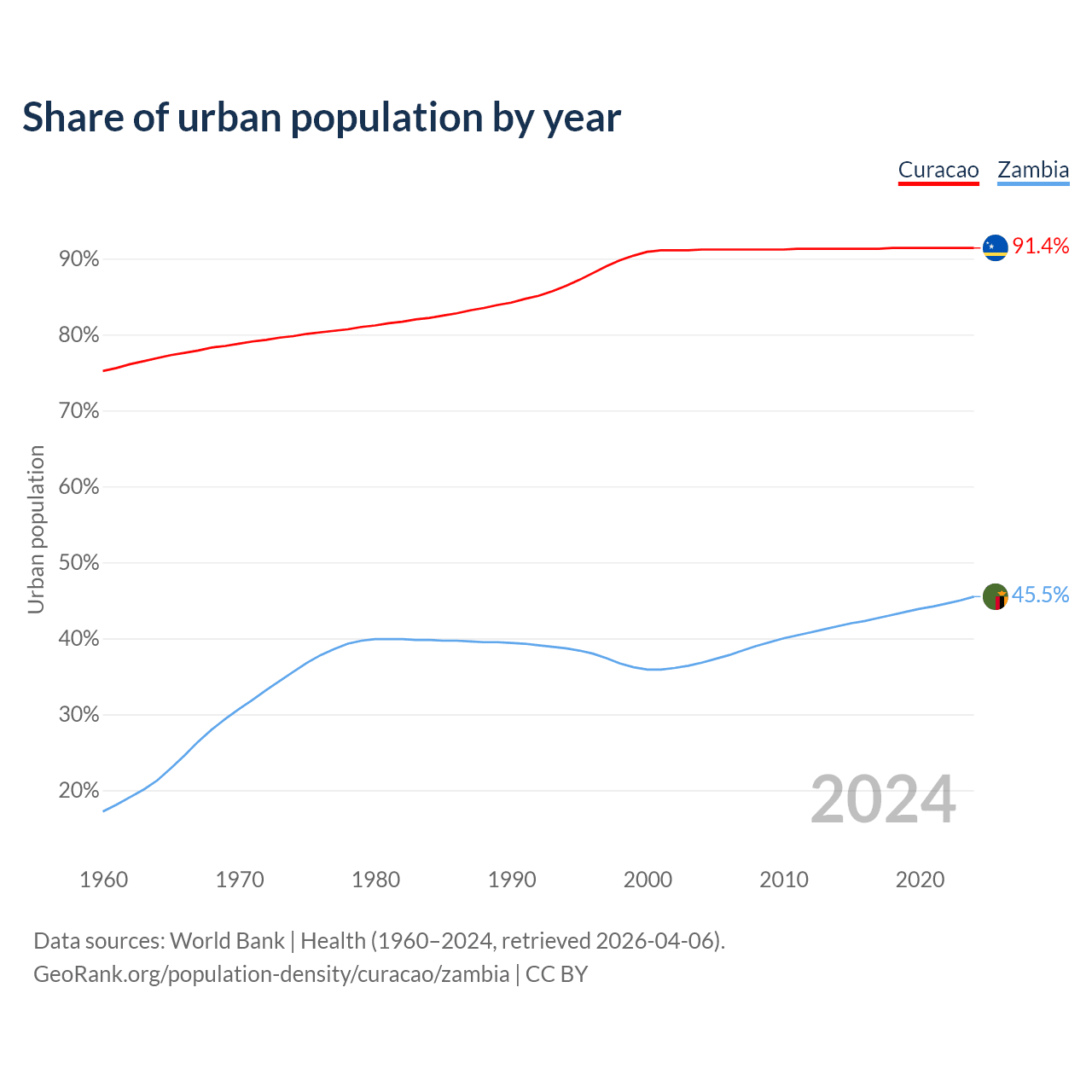 From 2004 to 2024, the share of urban population changed from 91.2% to 91.4% in Curacao and from 36.8% to 45.5% in Zambia.