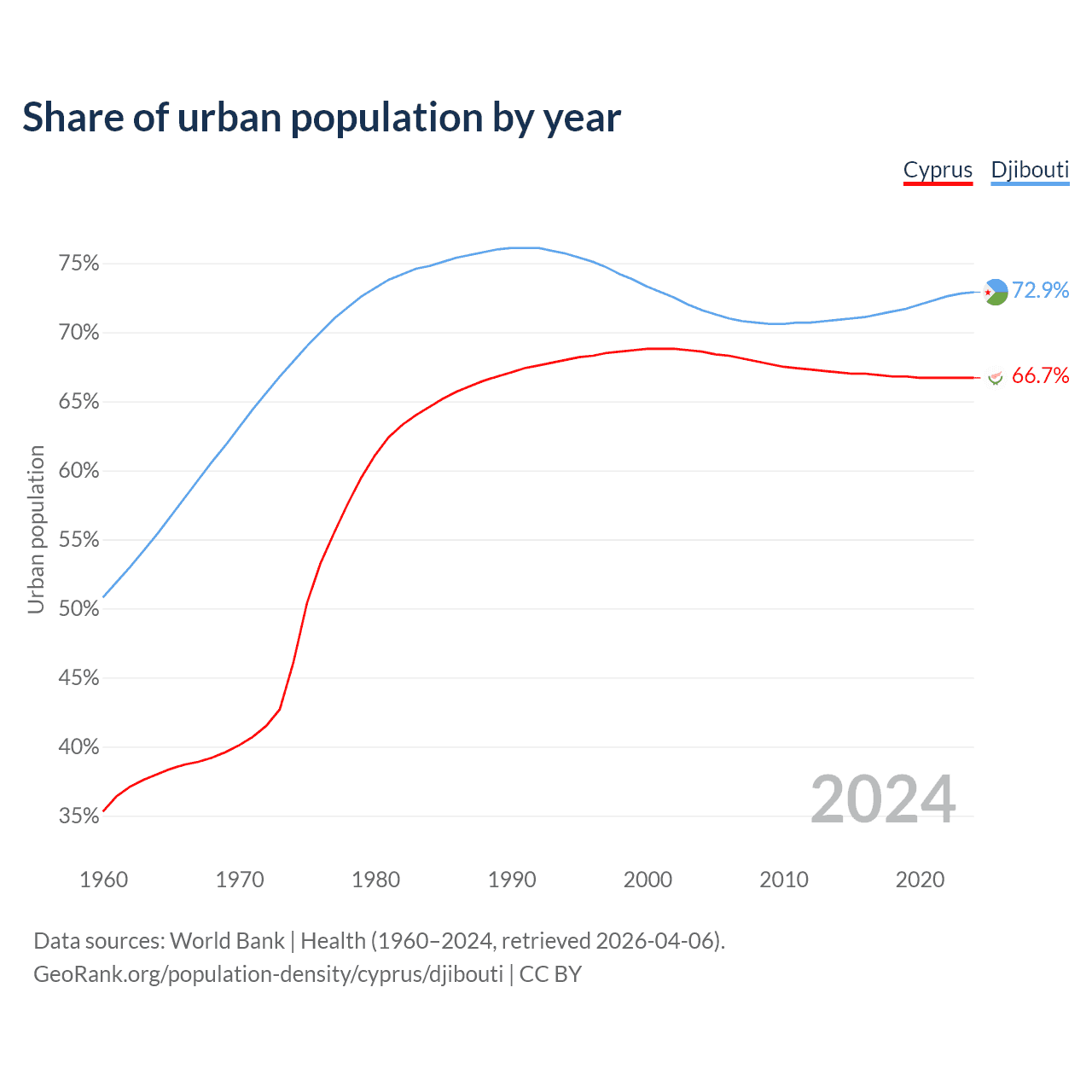 From 2004 to 2024, the share of urban population changed from 68.6% to 66.7% in Cyprus and from 71.6% to 72.9% in Djibouti.