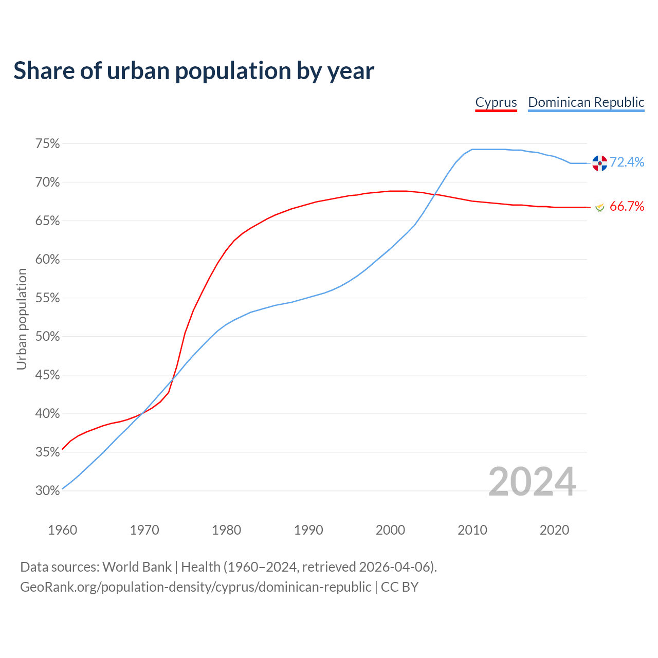 From 2004 to 2024, the share of urban population changed from 68.6% to 66.7% in Cyprus and from 65.9% to 72.4% in the Dominican Republic.