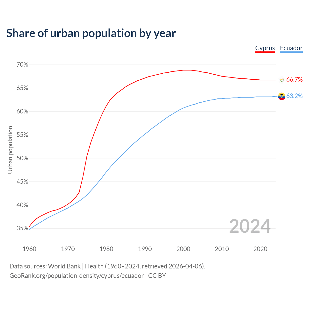 From 2004 to 2024, the share of urban population changed from 68.6% to 66.7% in Cyprus and from 61.8% to 63.2% in Ecuador.