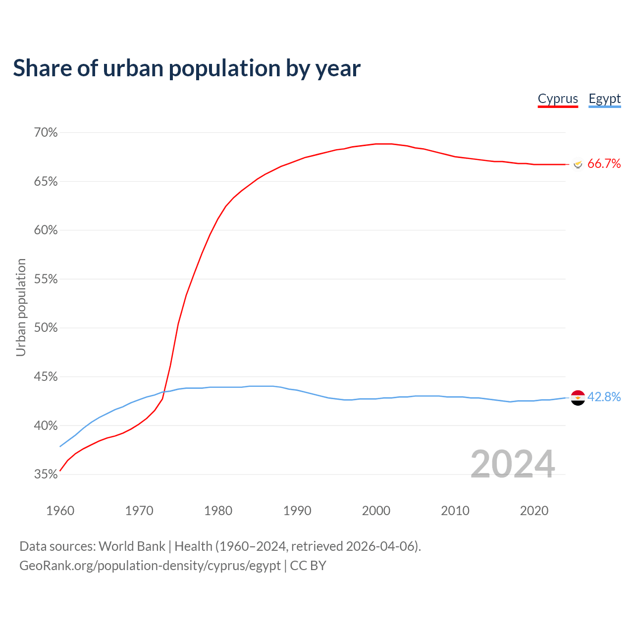 From 2004 to 2024, the share of urban population changed from 68.6% to 66.7% in Cyprus and from 42.9% to 42.8% in Egypt.