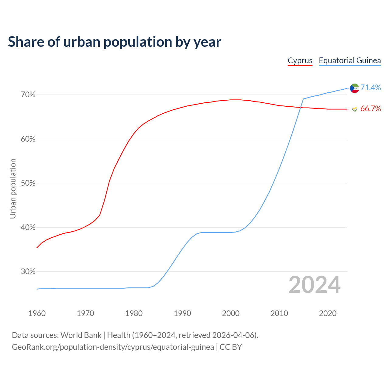 From 2004 to 2024, the share of urban population changed from 68.6% to 66.7% in Cyprus and from 40.9% to 71.4% in Equatorial Guinea.