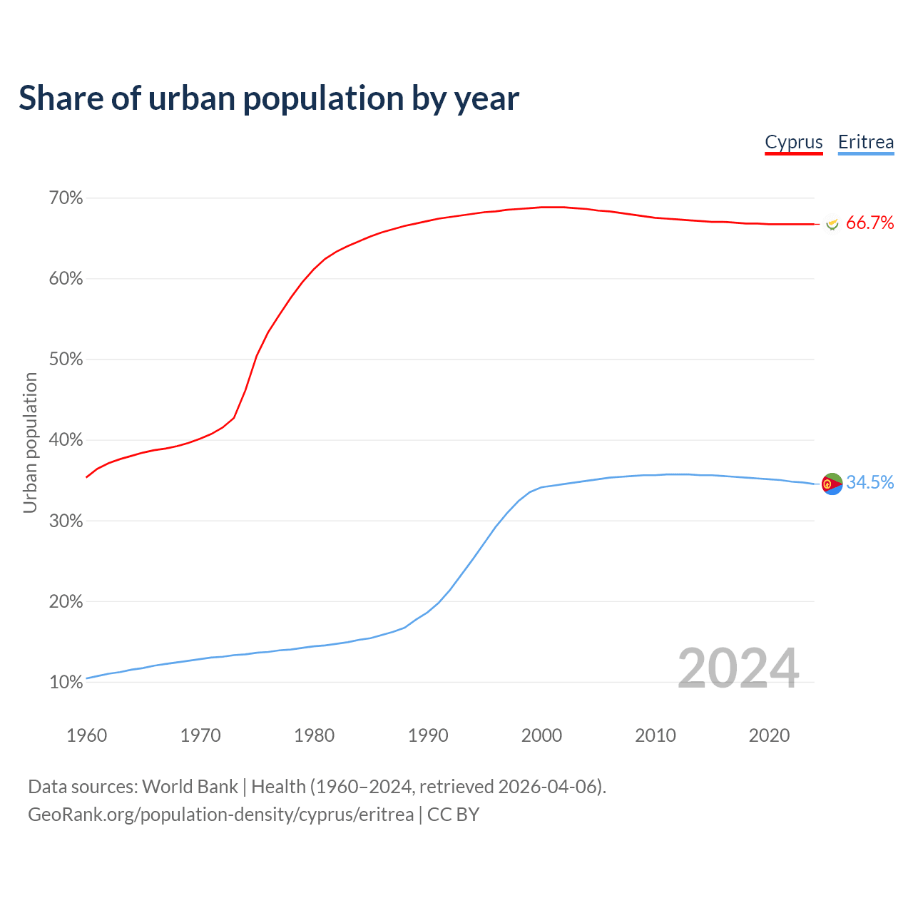 From 2004 to 2024, the share of urban population changed from 68.6% to 66.7% in Cyprus and from 34.9% to 34.5% in Eritrea.