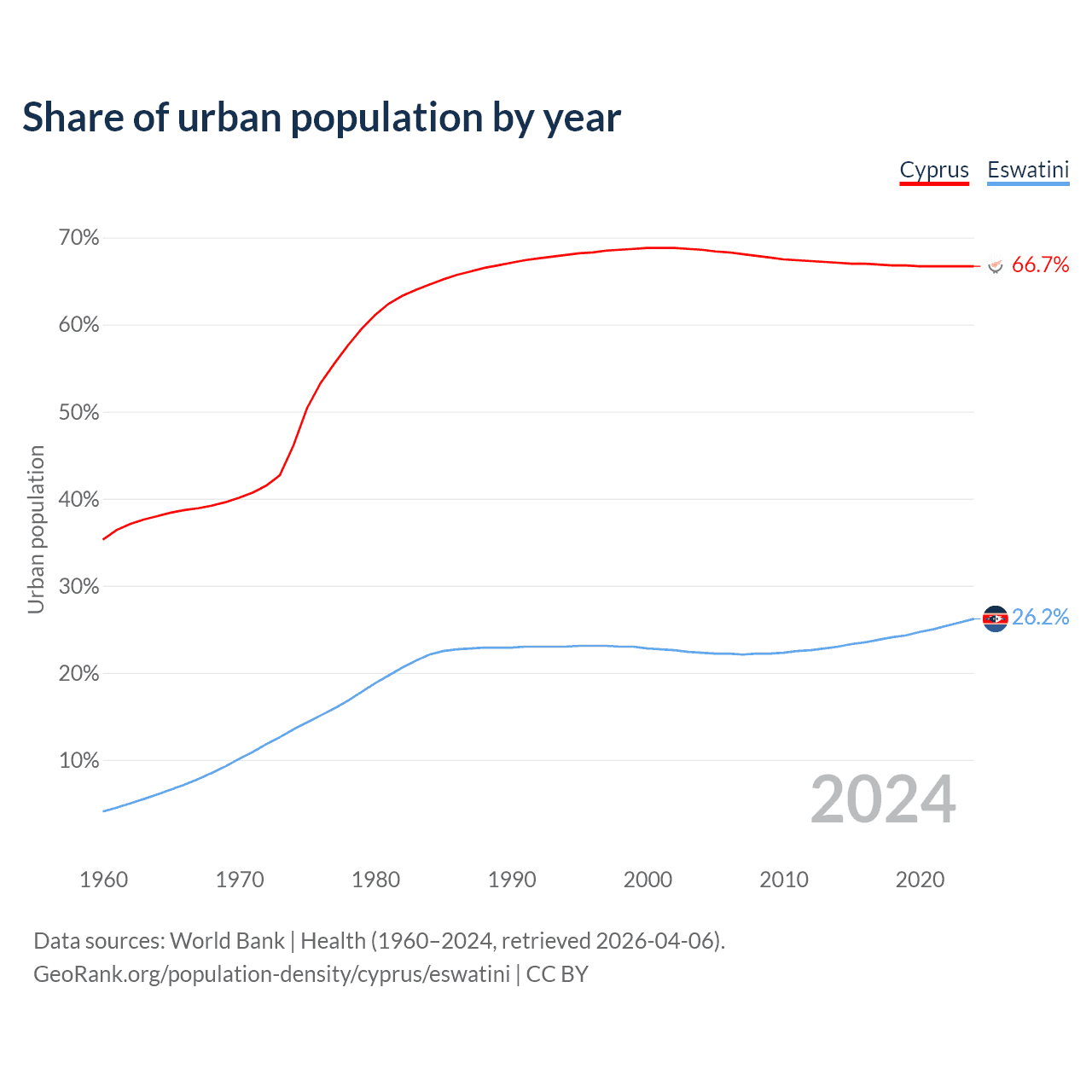 From 2004 to 2024, the share of urban population changed from 68.6% to 66.7% in Cyprus and from 22.3% to 26.2% in Eswatini.