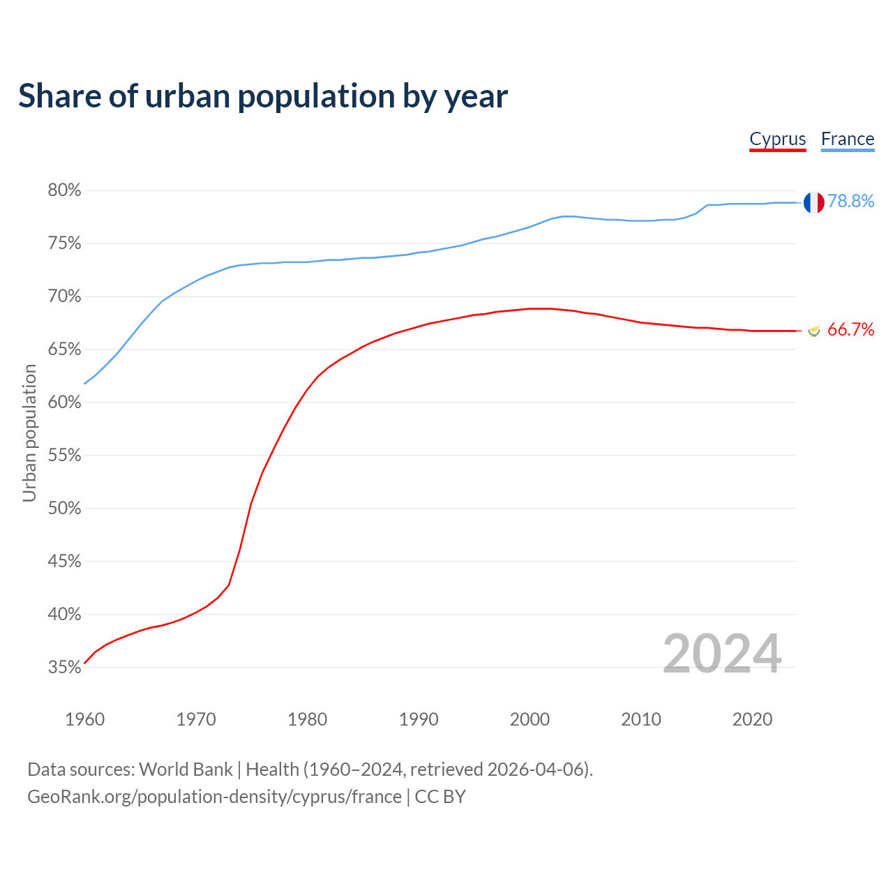 From 2004 to 2024, the share of urban population changed from 68.6% to 66.7% in Cyprus and from 77.5% to 78.8% in France.
