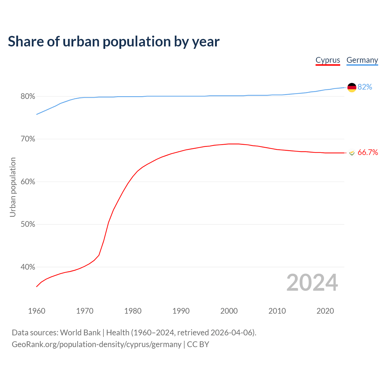 From 2004 to 2024, the share of urban population changed from 68.6% to 66.7% in Cyprus and from 80.2% to 82% in Germany.